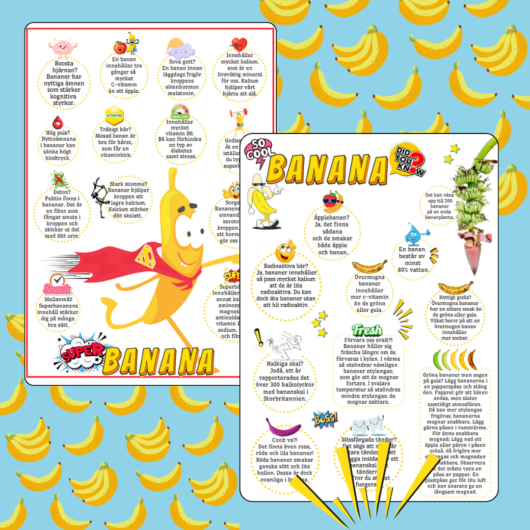 - Två posters med intressanta fakta. Den ena fokuserar på bananens otroliga innehållsämnen och vad dem gör med kroppen. Den andra har fokus på coola fakta om bananen.