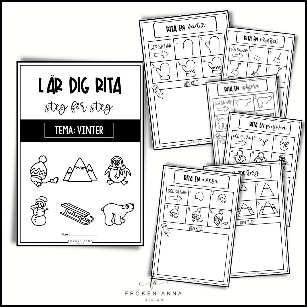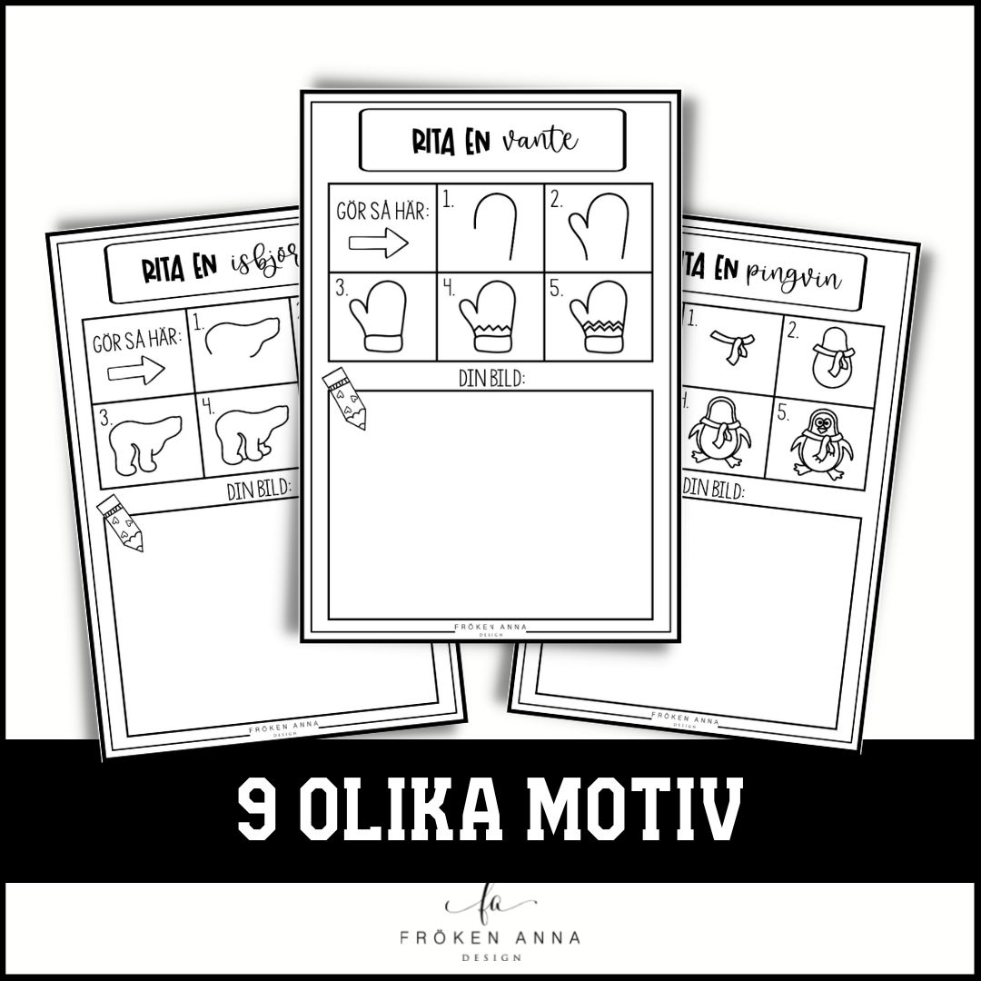 I detta material får barnen / eleverna, steg för steg, lära sig att rita 9 olika vintermotiv. Materialet leverras som A4 som enkelt kan sättas ihop till ett häfte och delas ut. Välj alla bilder eller de som passar din barn- eller elevgrupp.