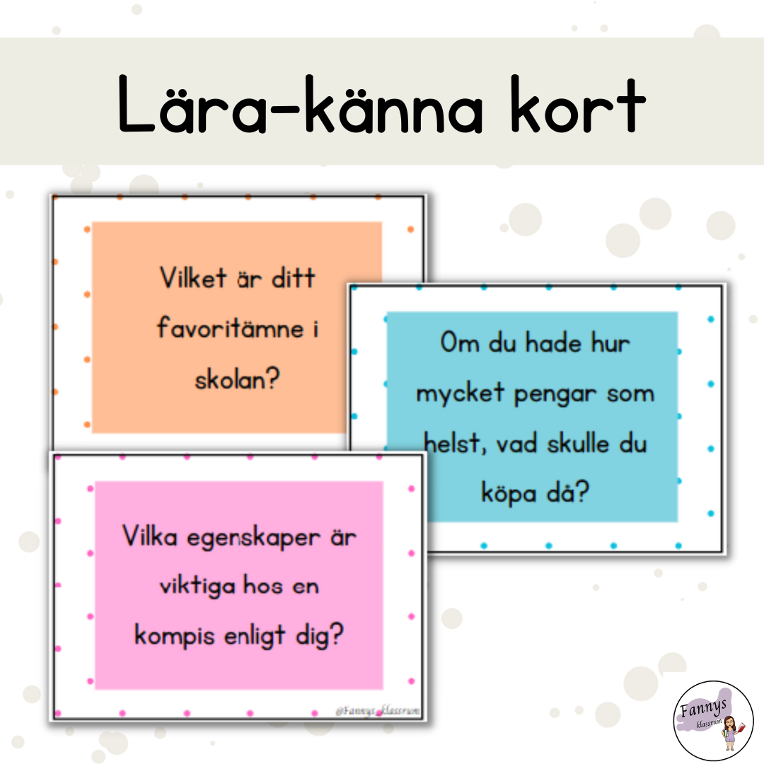 Kort med frågor där eleverna får chans att lära känna varandra. Kan exempelvis användas med den kooperativa metoden ”fråga-fråga-byt”. Materialet innehåller totalt 28 kort.