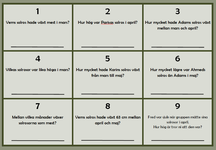 Låt eleverna svara på frågorna på korten med hjälp av tabellen. De besvarar korten i nummerordning. Korten avancerar i svårighetsgrad. Alla grupper kanske inte hinner alla kort, vilket är ok. Sätt en tid när det är dags att börja med linjediagrammet.