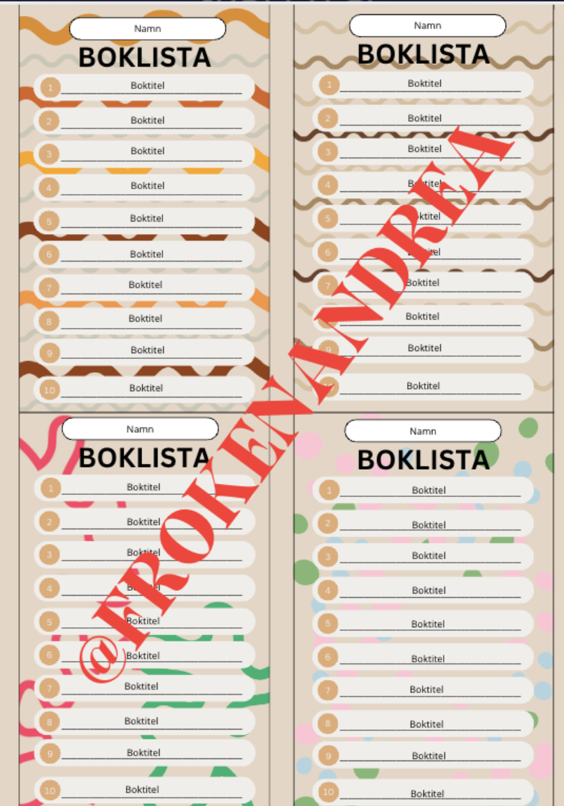 4. Fyra sorters boklistor där eleverna kan dokumentera antalet böcker de läst.