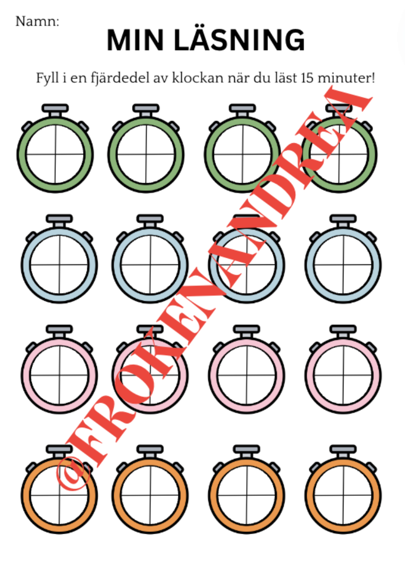 5. “Min läsning” är elevernas kartläggning av deras enskilda läsning. De fyller i en fjärdedel av klockan när de läst 15 minuter och samlar heltimmar.