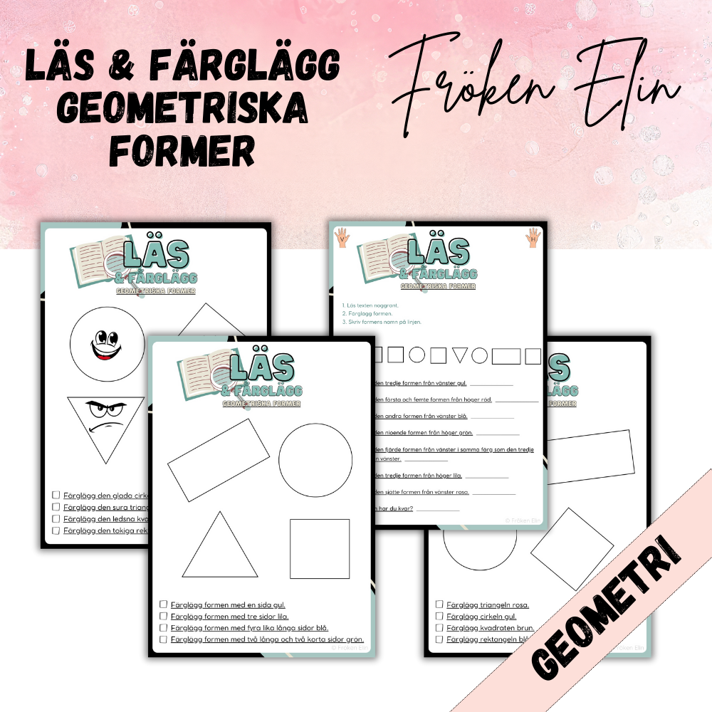 Läs och färglägg: geometriska former. Finns i fyra olika nivåer varav den sista även övar på höger och vänster samt ordningstal. Samtliga nivåer behandlar formerna cirkel, kvadrat, rektangel och triangel.