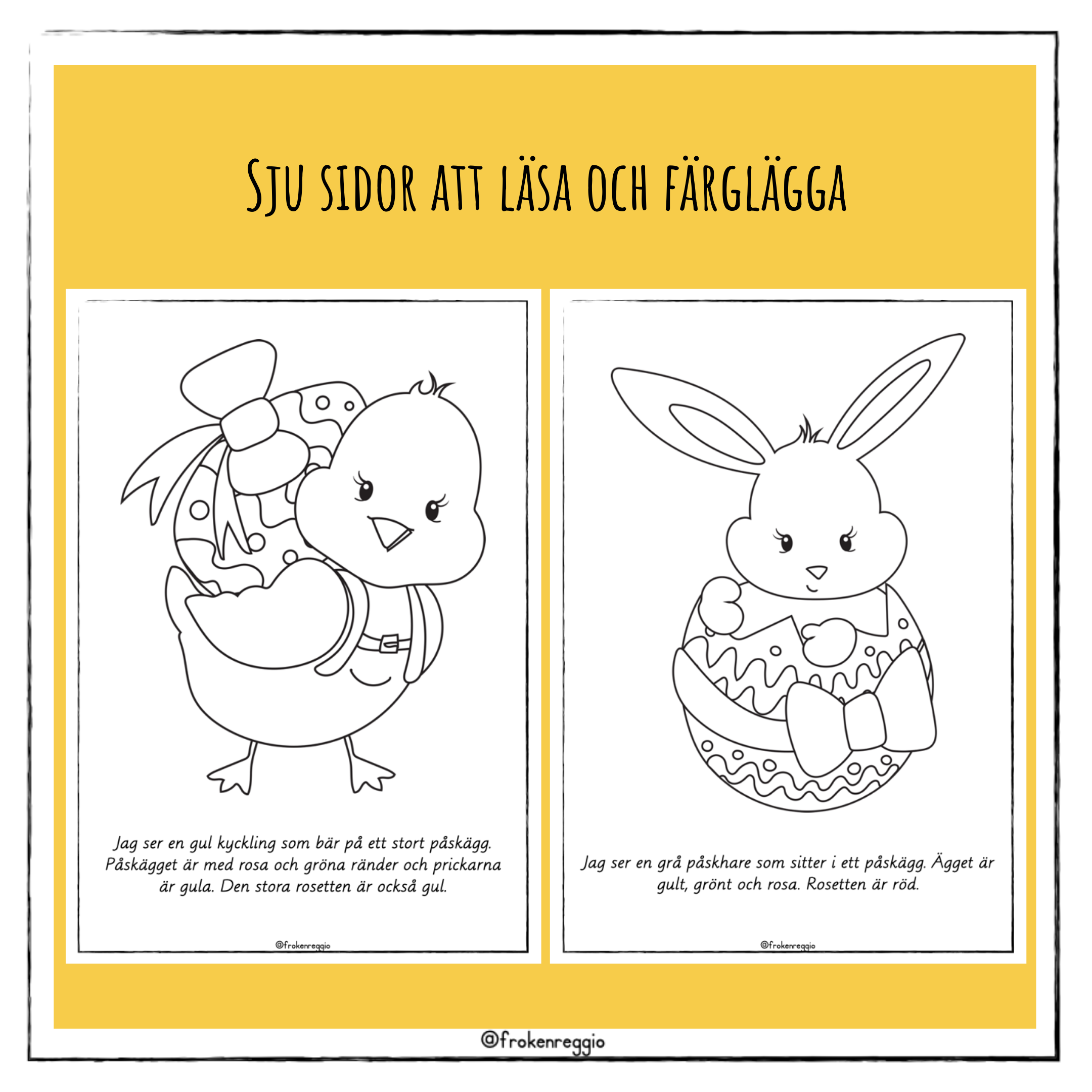 7 påskinspirerade färgläggningsbilder med instruktioner om hur de ska färgläggas.