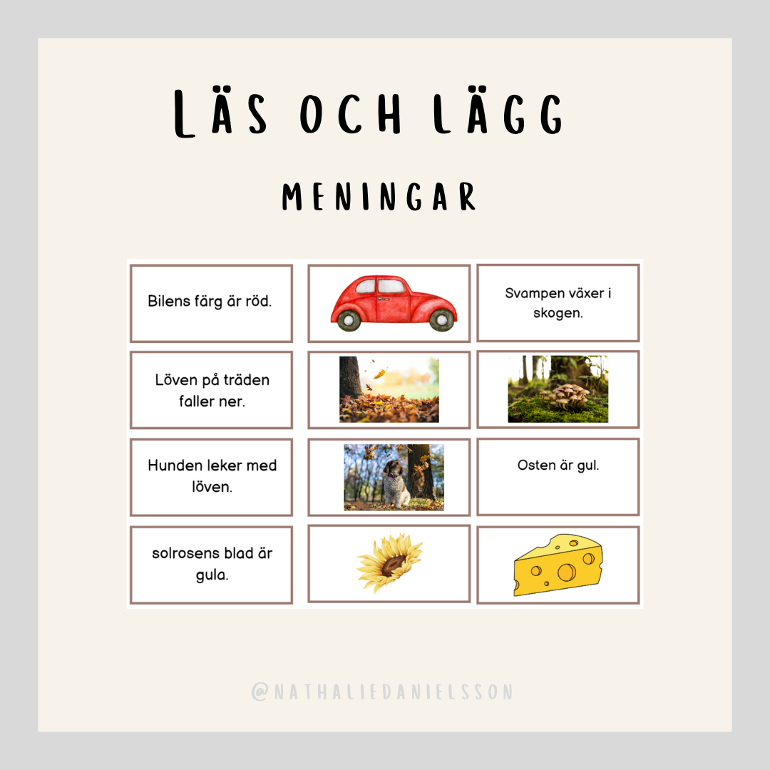 Detta material innehåller 24st meningar av olika längd och utformning med tillhörande bild som passar till meningen dvs totalt 48 st kort.