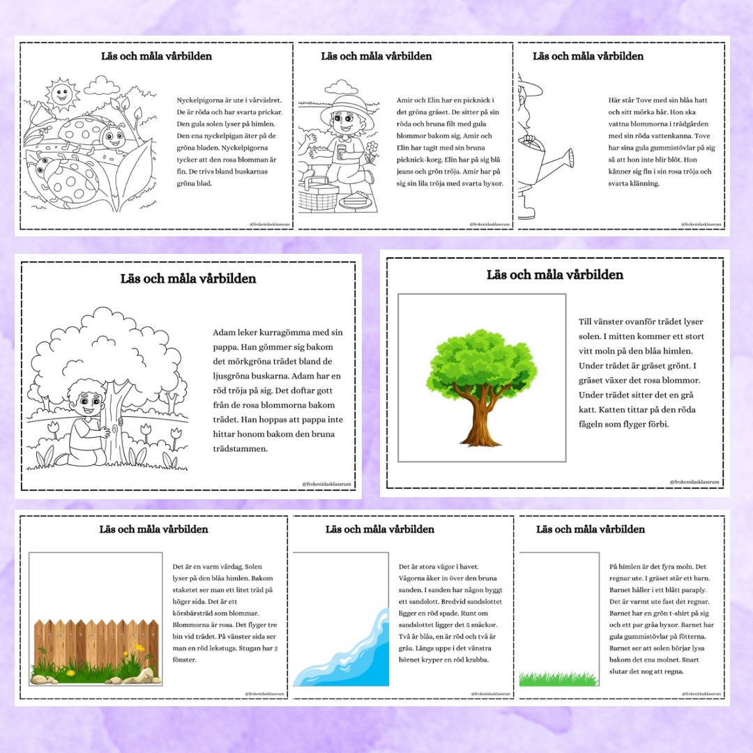 Läsförståelse, 8 arbetsblad med läsa och måla.