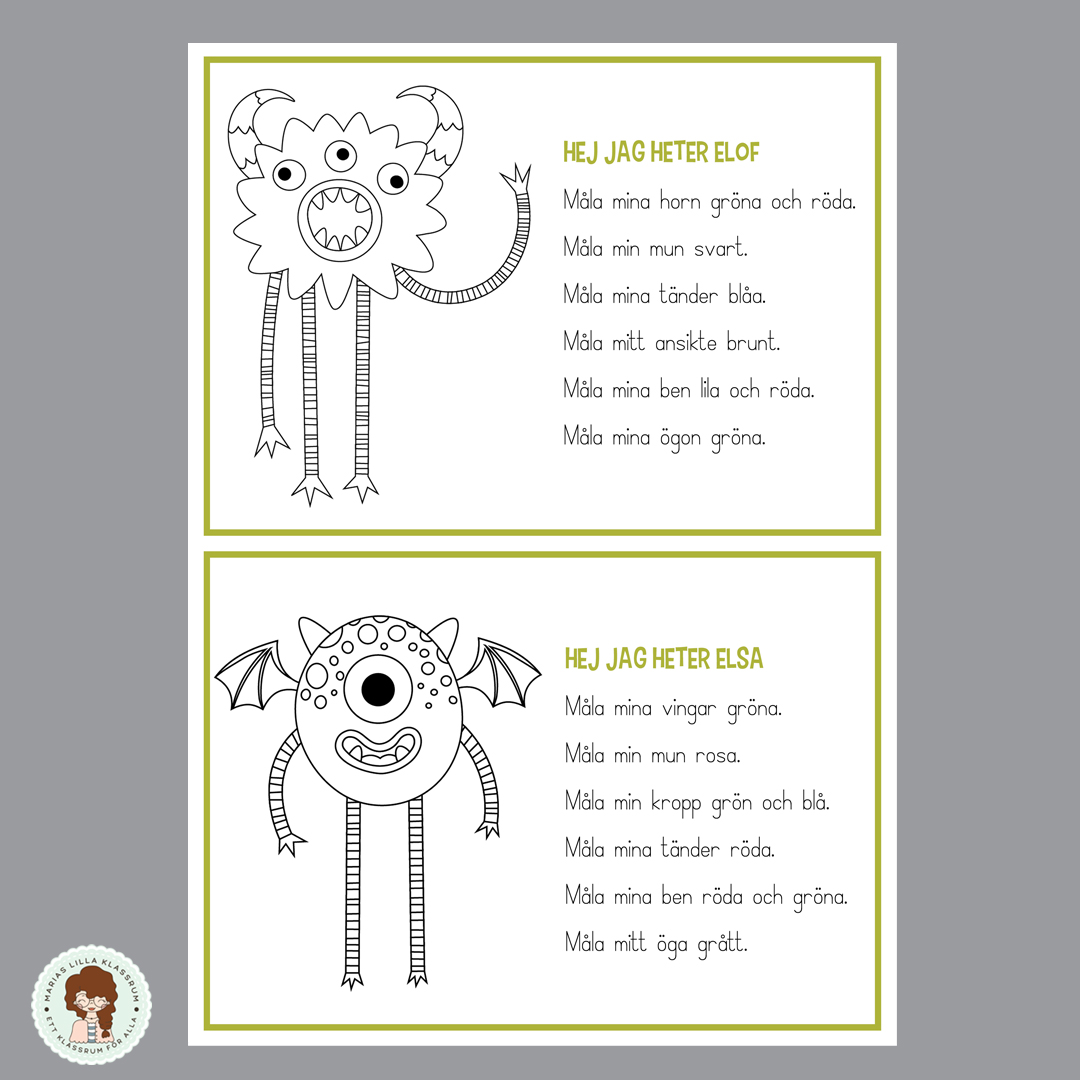 8 kort med enkla texter. Läs texten och färglägg monstret.