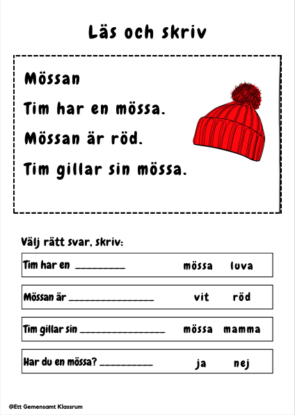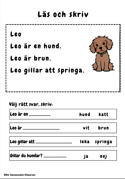 Ett arbetshäfte för att börja träna på läsförståelse eller för de elever som behöver ett anpassat material kring läsförståelse. Varje arbetsblad innehåller en kort och enkel text. Efter att ha läst texten ska eleven svara på 3 frågor, varje fråga har 2 alternativ där svaret står i texten. Eleven ska hitta rätt svar, ringa in svaret och sen skriva svaret på raden.