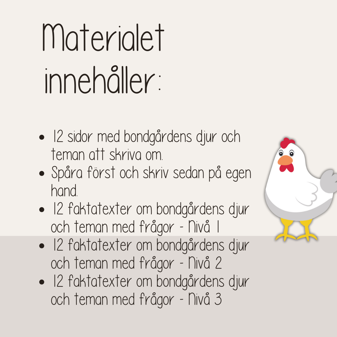 Träna på läsförståelse med tema Livet på bondgården. Materialet innehåller tolv faktatexter om olika djur och teman på bondgården. Varje ämne har en lästext med tillhörande frågor. Materialet finns i tre olika nivåer – Nivå 1: Mycket lättläst, Nivå 2: För elever som kommit igång med läsningen, Nivå 3: För elever som läser bra.