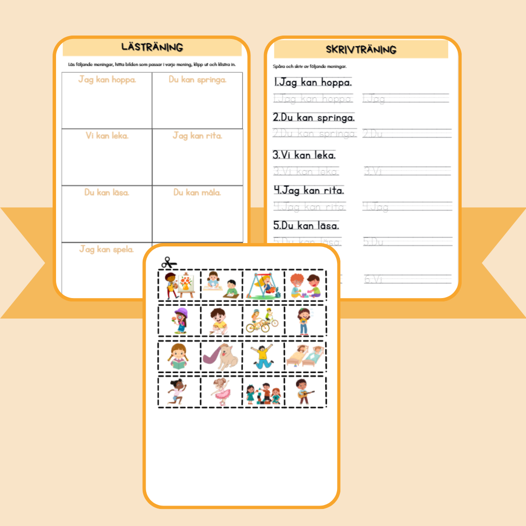Läs – och skrivträna, spåra, skriv, klippa ut samt klistra in med eleverna med hjälp av detta material. Det innehåller 8 sidor med enkla meningar och 2 sidor med bilder. Häftet är uppdelad i två olika svårighetsnivåer, den gula delen är den lätta nivån och den gröna nivån är lite mer utmanande. Materialet är väl anpassad till förskoleklasselever eller till elever som precis har knäckt läskoden.