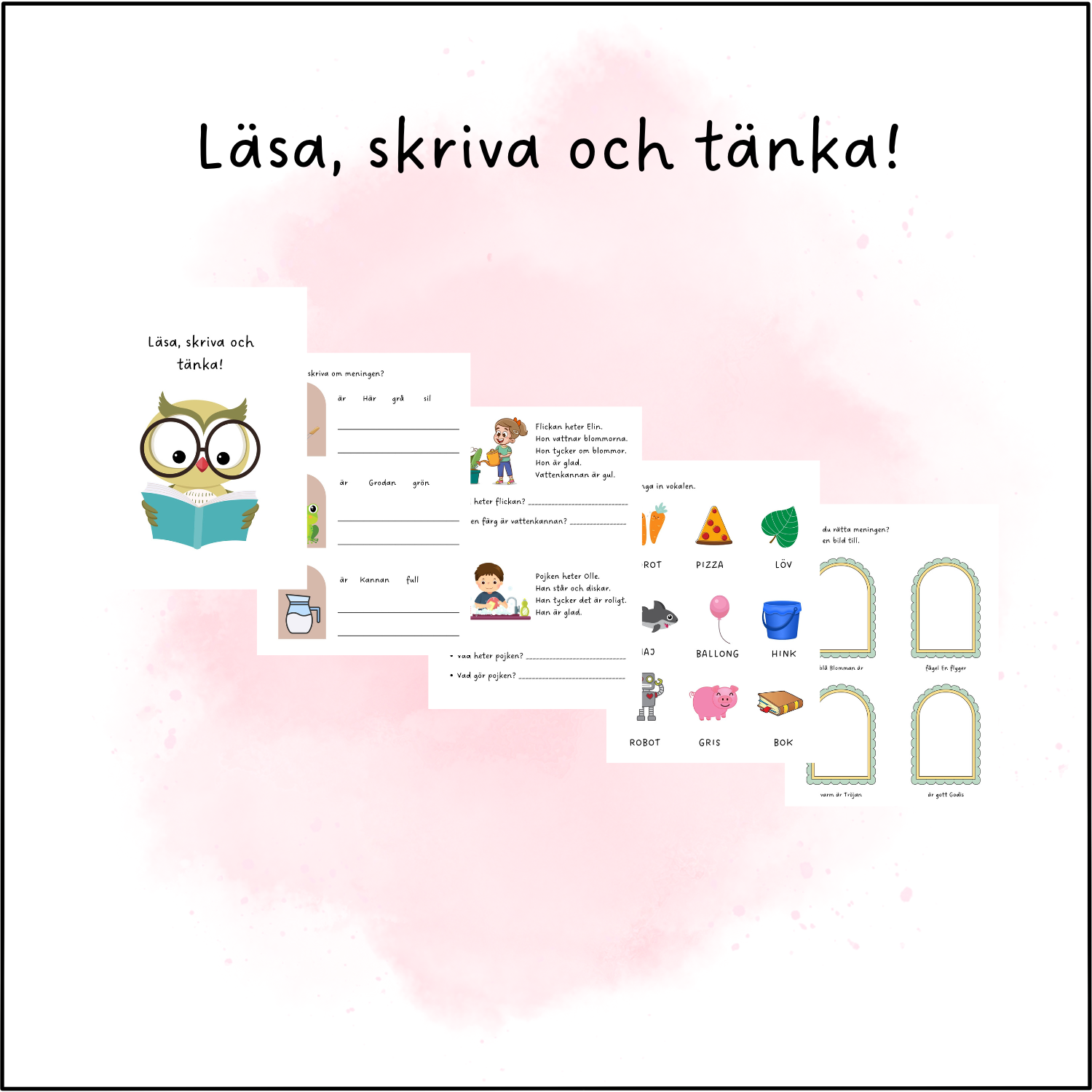 Här kommer ett häfte på totala 19 sidor där ni kan läsa, skriva och tänka. Här får ni öva på att läsa och svara på frågor, skriva bokstäver som saknas och sedan läsa en enkel mening och rita en bild till.