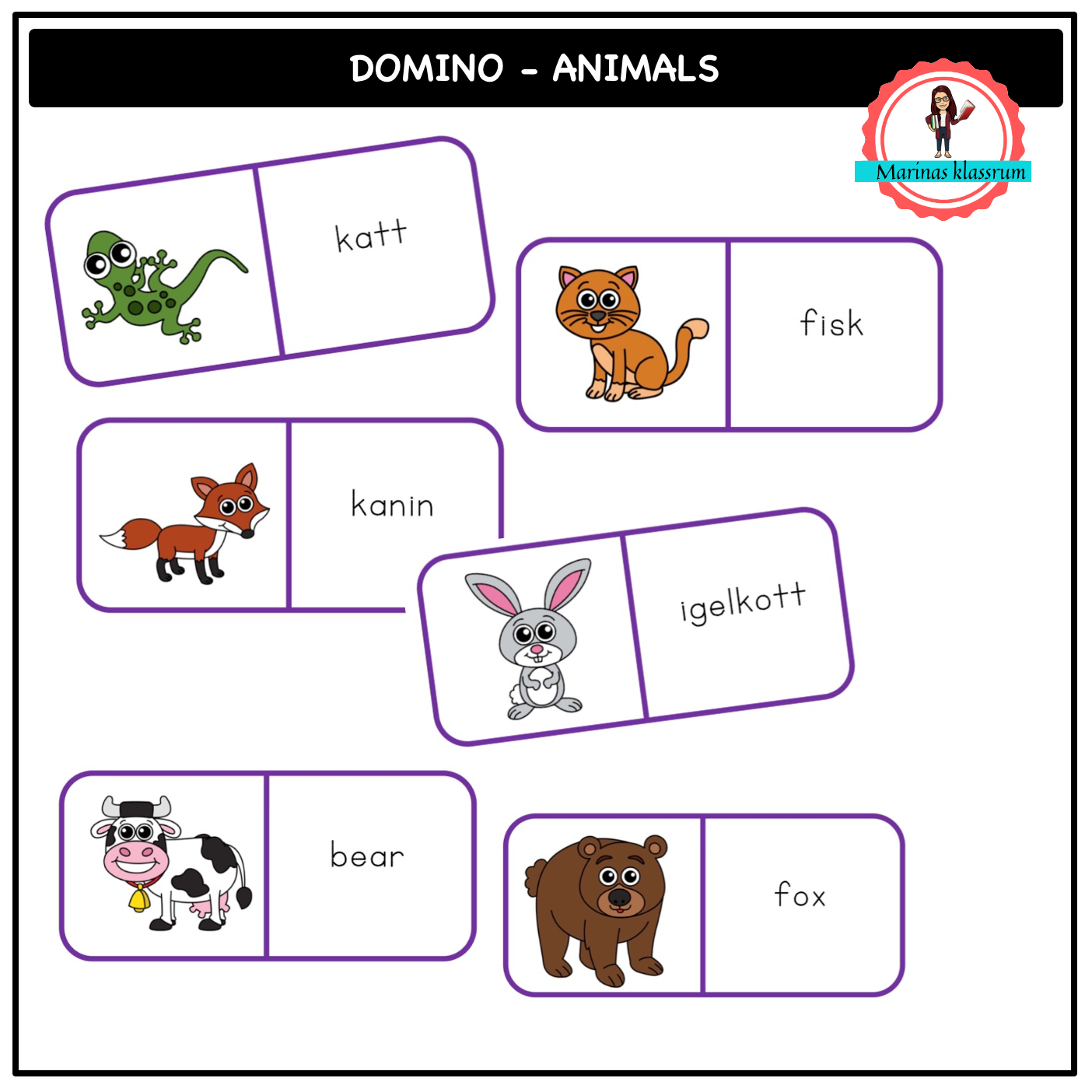 Ett läsdomino som eleverna kan träna engelska ord på ett lekfullt sett antingen ensam eller i mindre grupper. Det är 39 olika djur som tränas. Laminera korten så håller de sig fina i många år. Den svenska versionen passar bra för nyanlända elever som lär sig svenska.