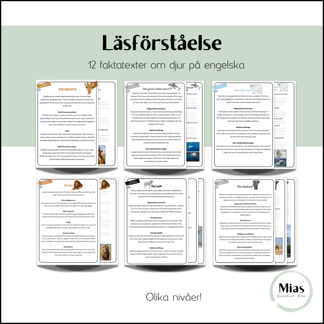 Jag har skapat 12 olika faktatexter om olika djur på engelska. Det är ett utmanade språk och jag skulle rekommendera texterna för årskurs 4-6 för de elever som behöver utmaning. Kan även fungera för år 7-9.