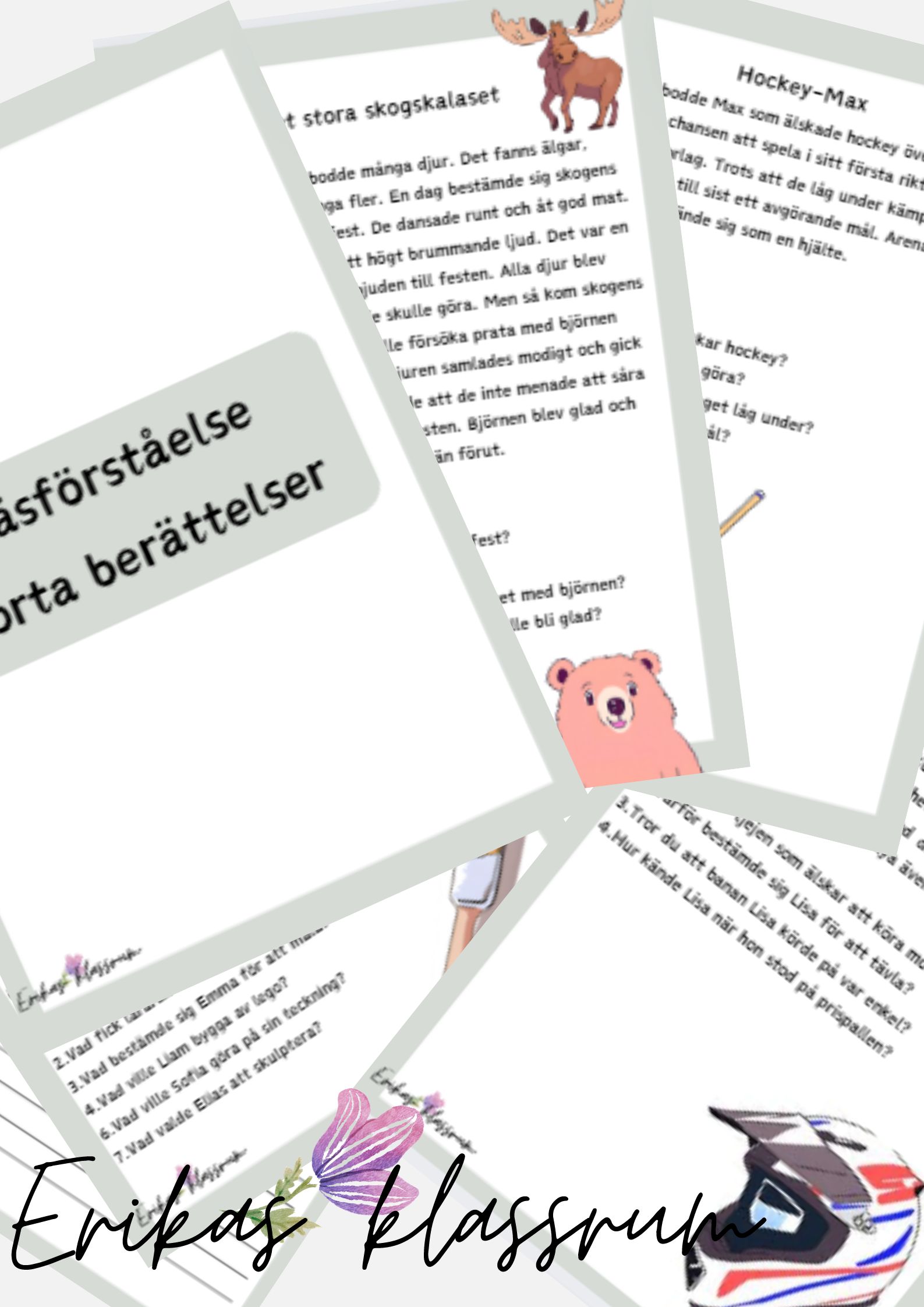 Detta häfte är ett läsförståelsehäfte med berättelser och tillhörande frågor. Berättelserna är i varierande längd, passar kanske främst för åk2 och åk3. Häftet innehåller sidor med tomma rader där eleverna har möjlighet att utveckla sina svar. Tanken är att eleverna skall öva på att svara med hela meningar.