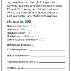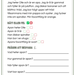 Ett häfte som tränar läsförståelse. 30 sidor totalt. Samma texter som mina ”läskort” som finns här på sidan (några texter är korrigerade).