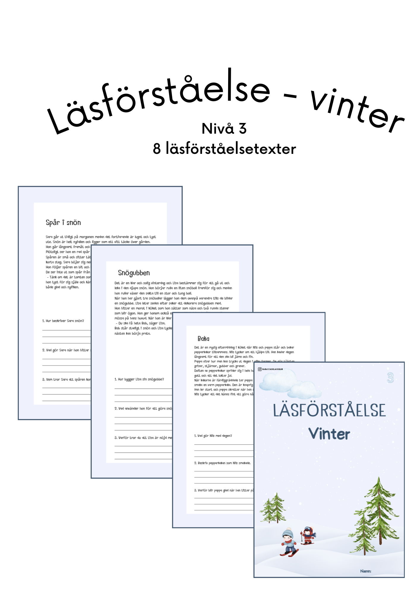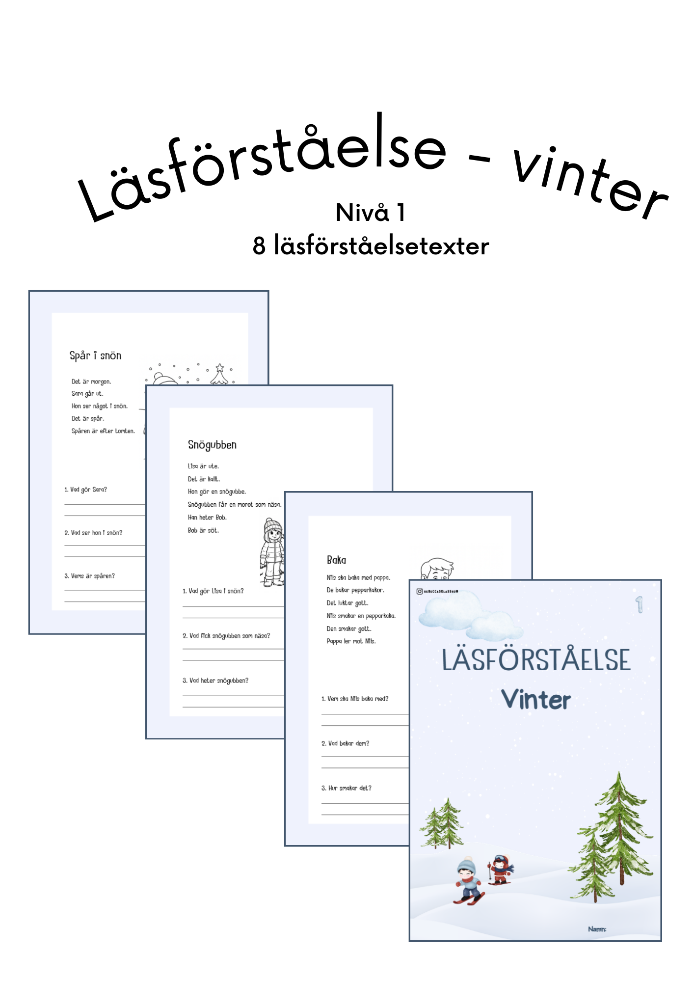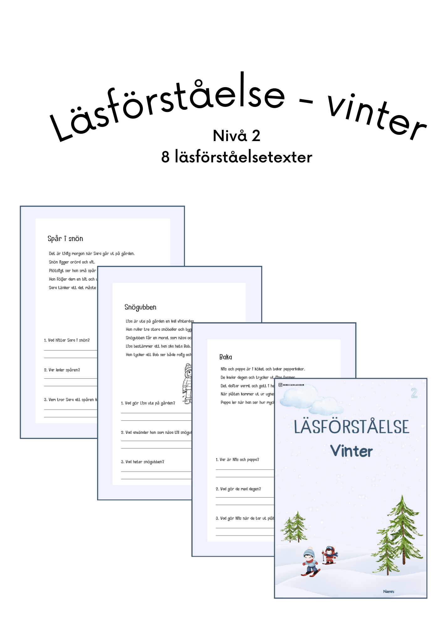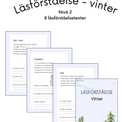 Läsförståelsehäften med 8 olika texter per häfte. Till varje text är det tre läsförståelsefrågor och en målarbild.