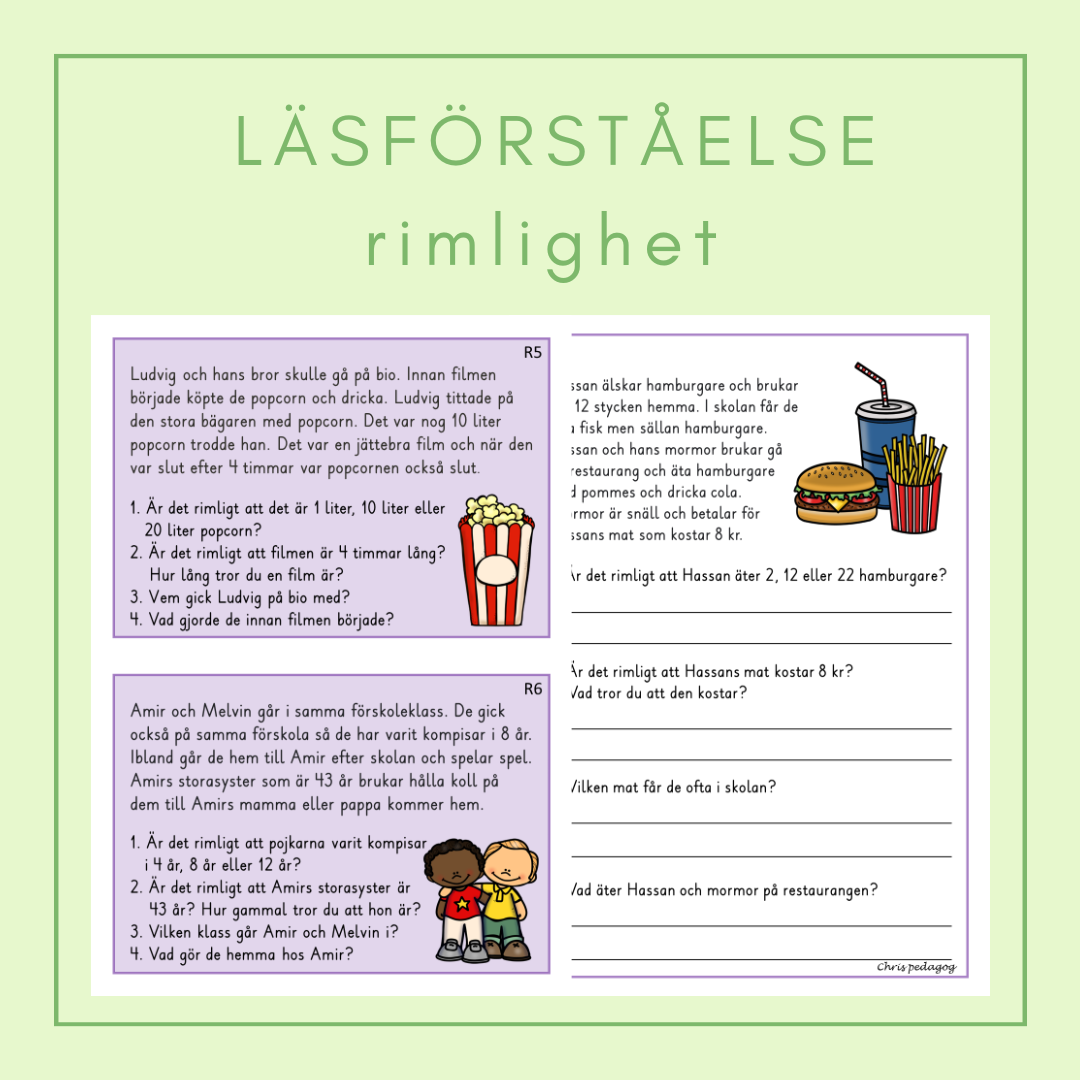 De första två frågorna handlar om rimlighet, en fråga med tre alternativ och en fråga där eleven själv ska skriva ett rimligt alternativ. De sista två frågorna är frågor på textens innehåll. Eleverna får träna på att uppskatta vikt, volym, ålder, pris, tid och antal. Till arbetsbladen finns en framsida om man vill göra ett häfte.