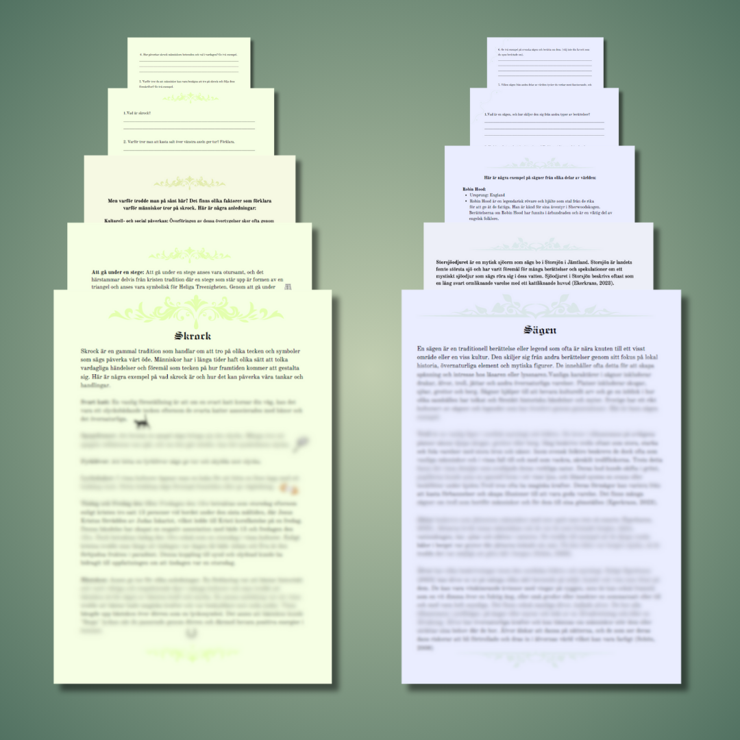 Skrock och Sägner är ett läsförståelsehäfte som beskriver några skrockar och sägner i Sverige och världen. Det är en perfekt uppgift att börja med innan en längre skrivuppgift där elever kan få idéer och inspiration för deras egna karaktärer och berättelser.