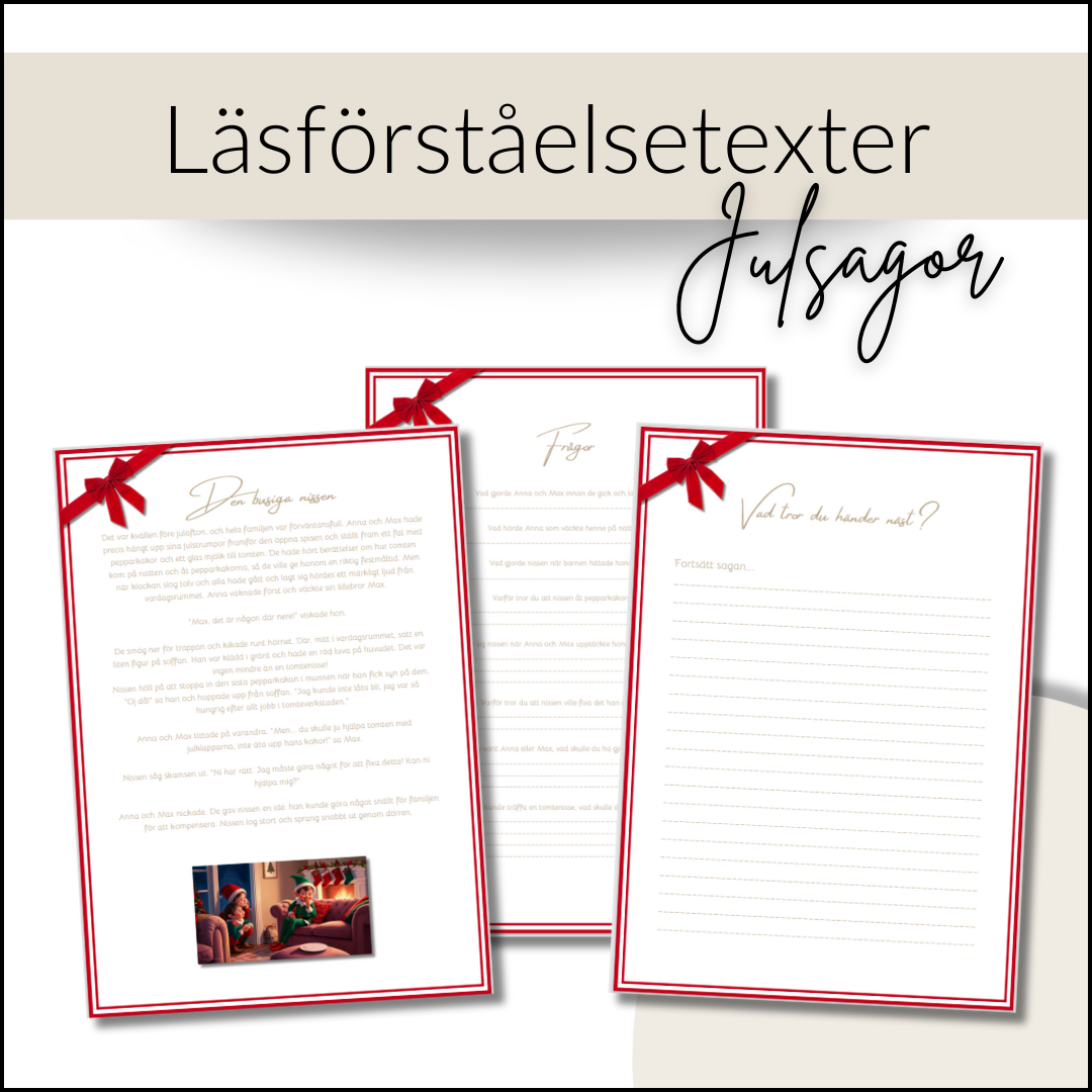 Här kommer 5 olika julsagor med tillhörande frågor. Frågorna är på, mellan och bortom raderna. Sagorna slutar även lite abrupt så till materialet kommer en sida där eleven kan skriva ett eget slut på sagan. Texterna är på olika nivåer där 2 är något svårare.