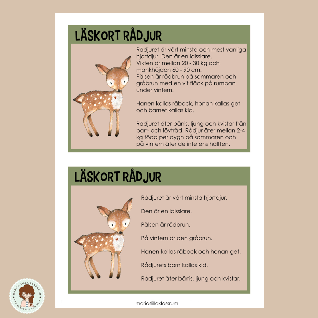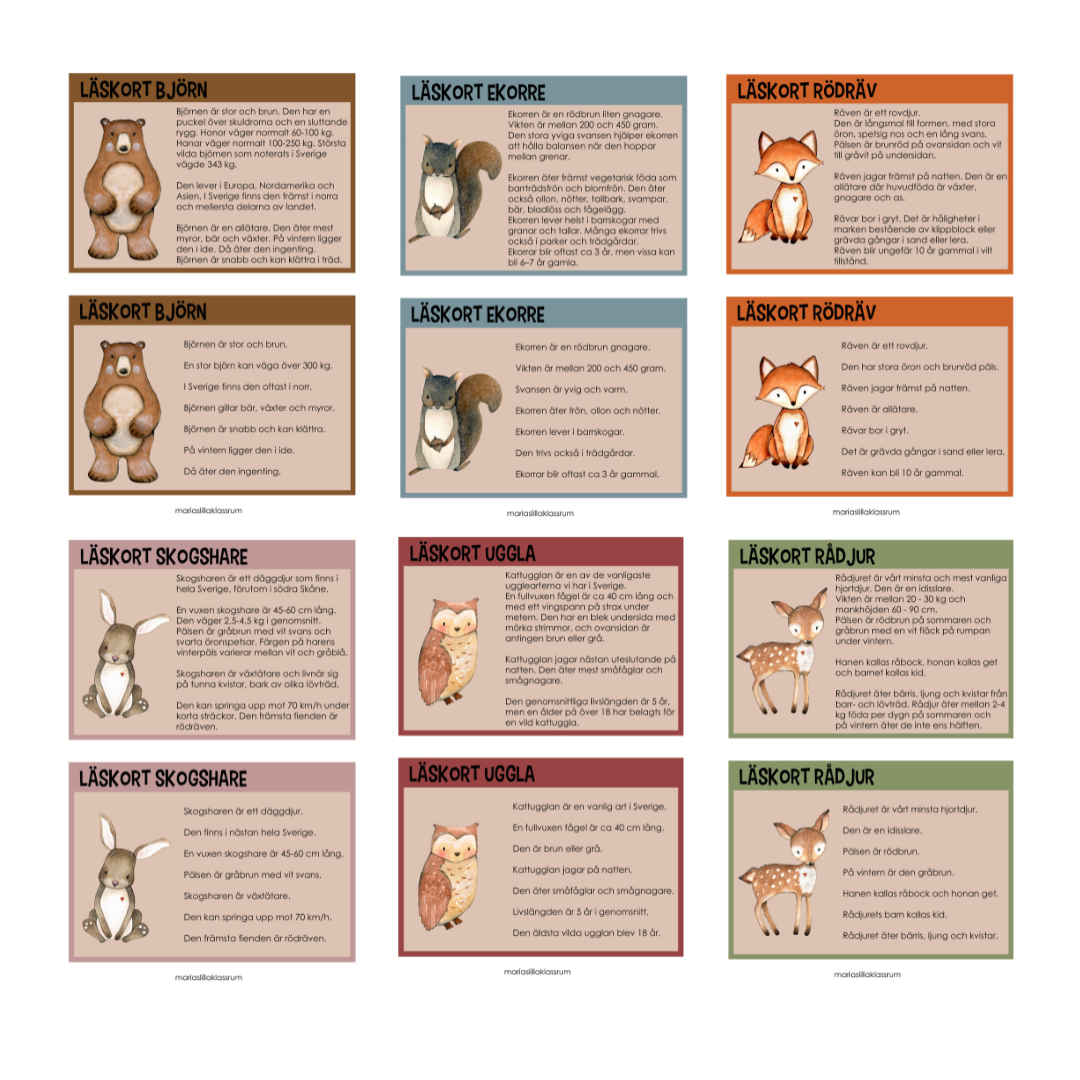 12 stycken läskort med enkel faktatext om djur. Två olika nivåer.