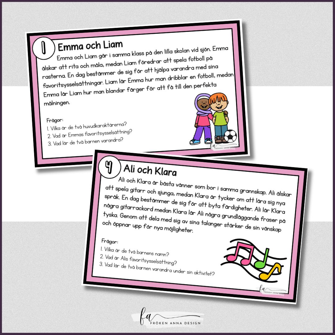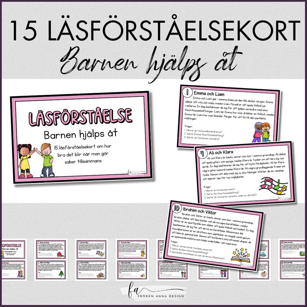 15 läskort med läsförståelse som handlar om hur bra det kan bli när man hjälps åt. Varje kort är numrerat och innehåller en text med tre efterföljande frågor.