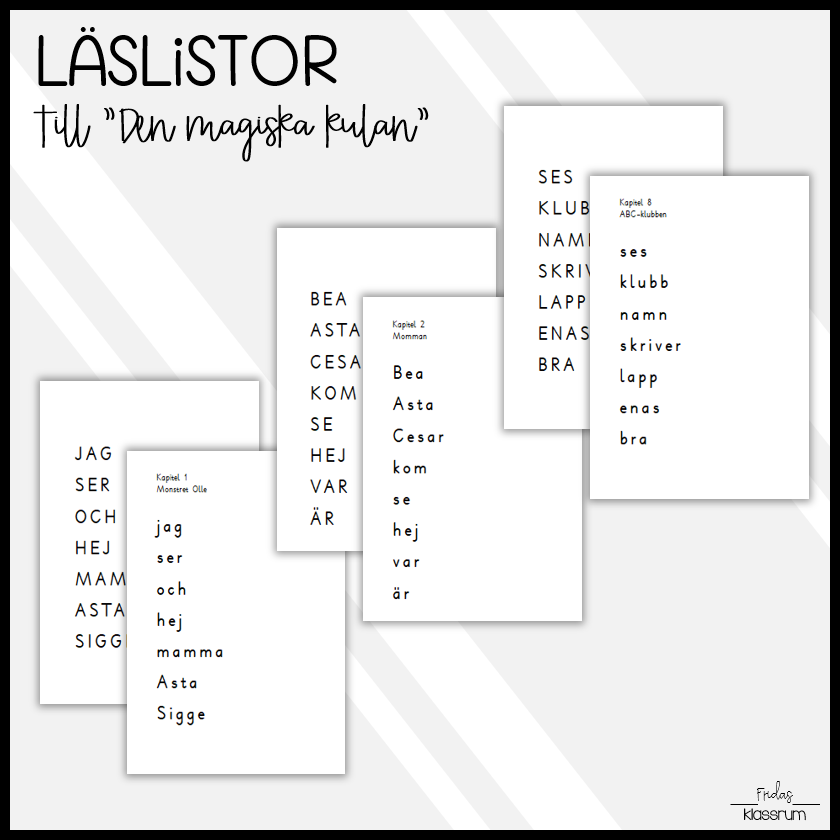 Läslistor till ”Den magiska kulan”. I materialet ingår en lista med 7-8 ord tillhörande varje kapitel. Orden står skrivna med både versaler och gemener. Ge i läxa eller ha som stödord för att minnas/återberätta.