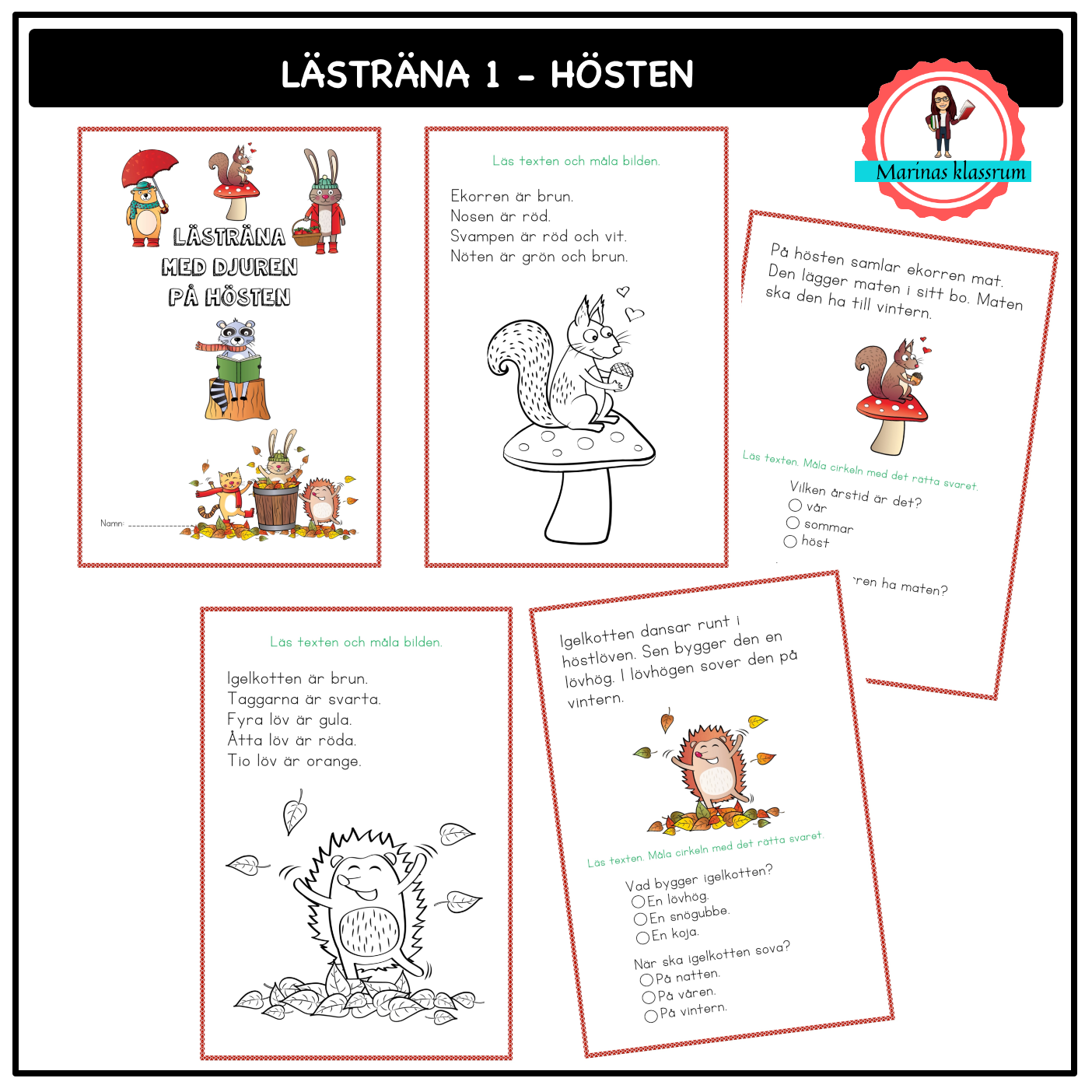 Ett läshäfte som tränar läsning med skogens djur om hösten. Det finns 7 olika djur och varje djur har två texter. Den ena texten läser eleven och får på så sätt reda på hur bilden ska målas. Den andra texten läser eleven och svarar sedan på frågor. Frågorna har tre olika svar och de markerar svaret som är rätt.