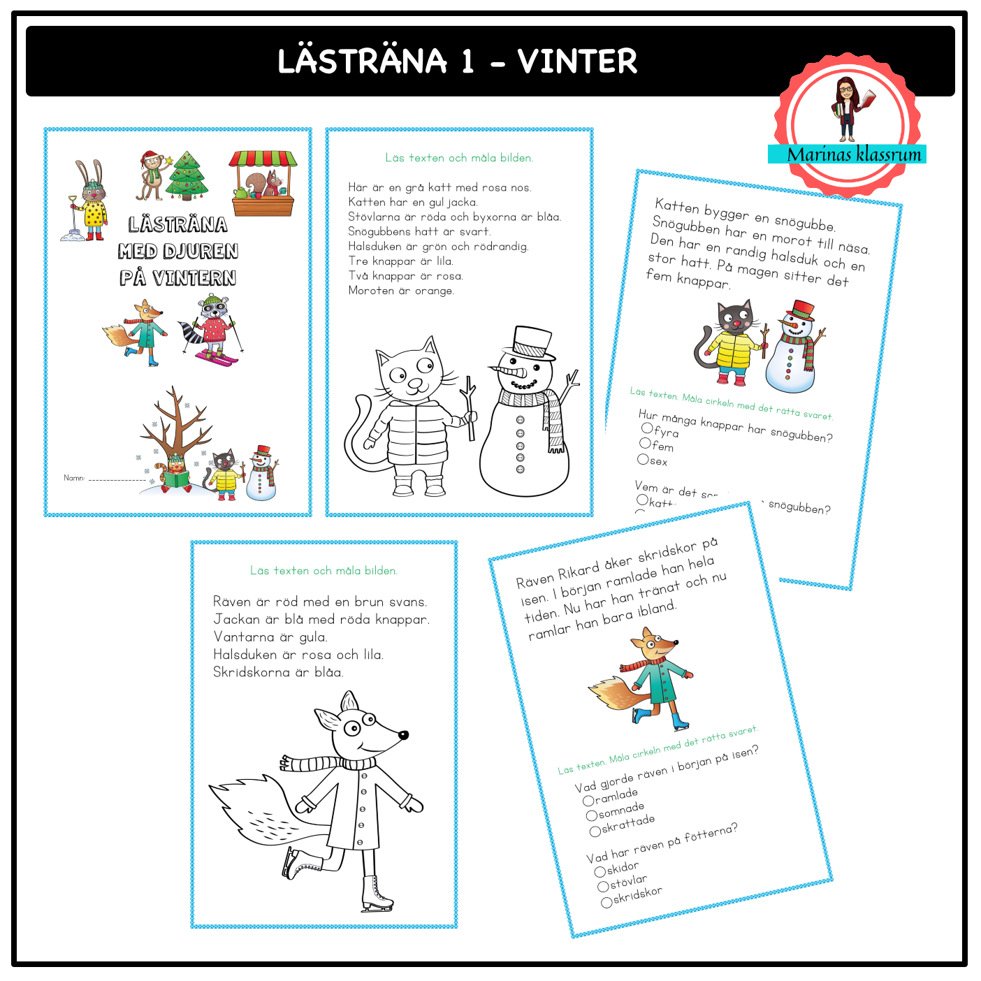 Ett läshäfte som tränar läsning med djuren på vintern. Det finns 7 olika djur och varje djur har två texter. Den ena texten läser eleven och får på så sätt reda på hur bilden ska målas. Den andra texten läser eleven och svarar sedan på frågor. Frågorna har tre olika svar och de markerar svaret som är rätt.