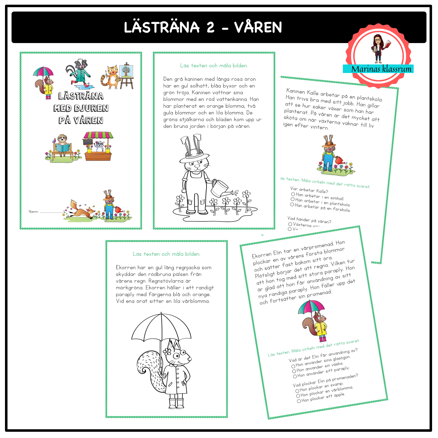 Ett läshäfte som tränar läsning med skogens djur på våren. Det finns 7 olika djur och varje djur har två texter. Den ena texten läser eleven och får på så sätt reda på hur bilden ska målas. Den andra texten läser eleven och svarar sedan på frågor. Frågorna har tre olika svar och de markerar svaret som är rätt.