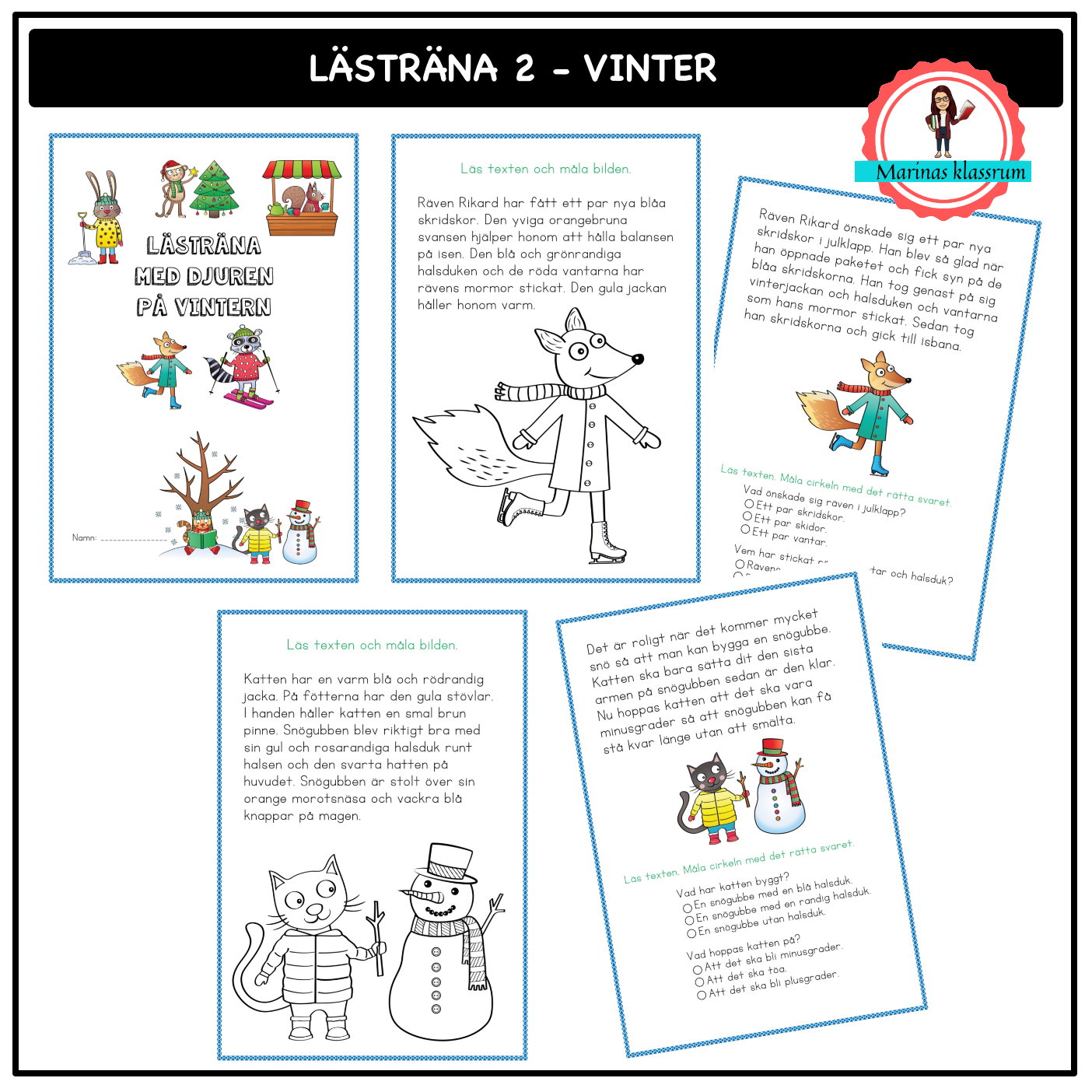 Ett läshäfte som tränar läsning med djuren på vintern. Det finns 7 olika djur och varje djur har två texter. Den ena texten läser eleven och får på så sätt reda på hur bilden ska målas. Den andra texten läser eleven och svarar sedan på frågor. Frågorna har tre olika svar och de markerar svaret som är rätt.