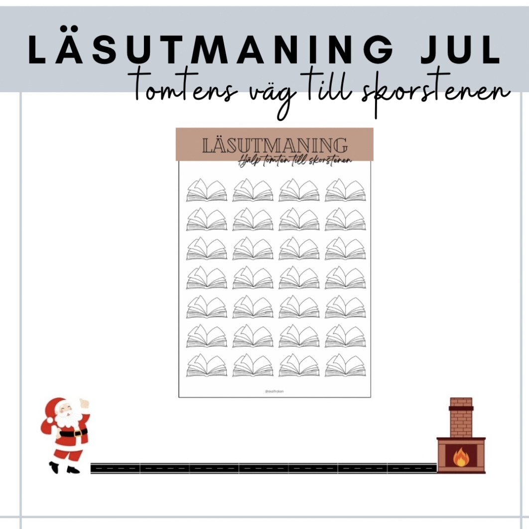 Tomten behöver ta sig till skorstenen för att kunna dela ut julklappar. Det är klassens läsning som avgör hur långt tomten kommer. Bestäm hur många sidor eleverna ska läsa för att få färglägga en bok – för varje bok får tomten ta ett steg närmare skorstenen. Trevlig läsning!
