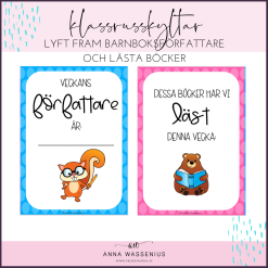 Det medföljer även två extra skyltar ”veckans barnboksförfattare och ”böcker vi läst denna vecka” som ni kan använda för att synliggöra vilka böcker ni läst högt tillsammans under veckan, samt om ni vill läsa fler böcker av samma författare under olika veckor.