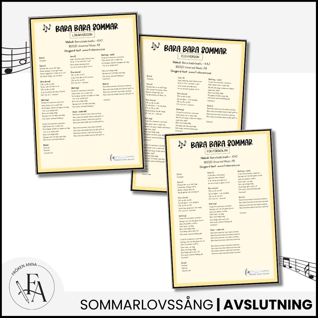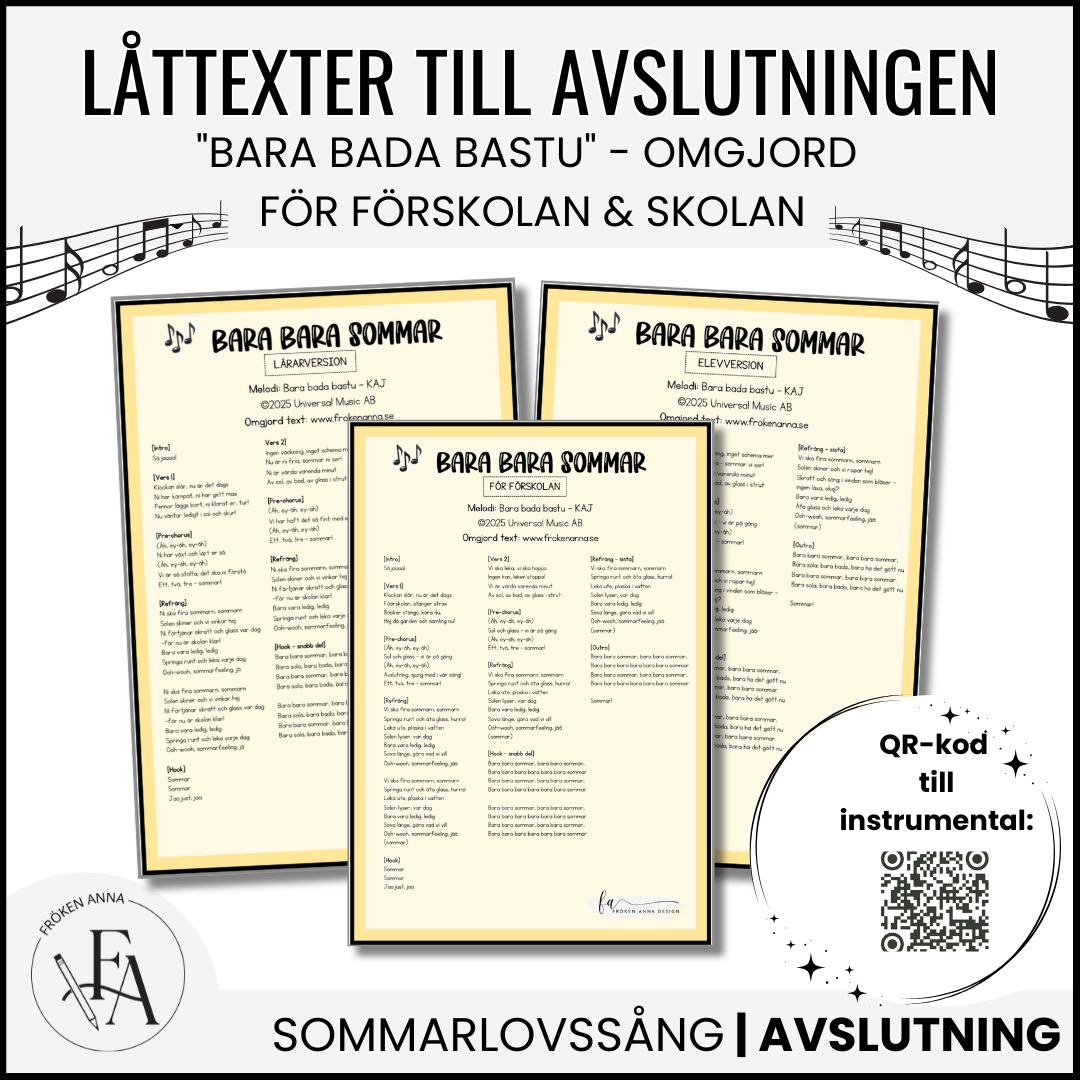 En omgjord låttext av KAJ:s ”Bara bada bastu” att sjunga på skolavslutningen. Tre versioner ingår: för elever, lärare i skolan och förskolan.