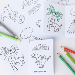 Min lilla målarbok tema dinosaurier. Ett A4-papper viks och klipps till en bok med åtta sidor. En målarbild att färglägga på varje sida. Instruktion på hur du viker medföljer (video och bild).