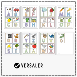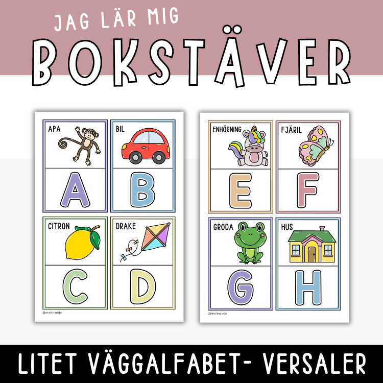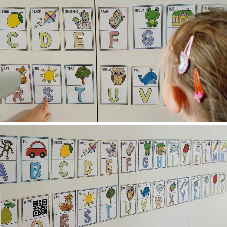 Öva på bokstäver och alfabetet med ett väggalfabet. Varje bokstavskort innehåller bokstaven, en figur som börjar på den bokstaven och tillhörande ord utskrivet. Allt i versaler.