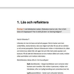 Häftet innehåller övningar där eleverna tränar på att reflektera, sammanfatta, diskutera, analysera och läsa högt. Syftet är att utveckla språkförmågan, ge förståelse för litteraturens roll och skapa kopplingar mellan egna erfarenheter och den svenska litteraturtraditionen.