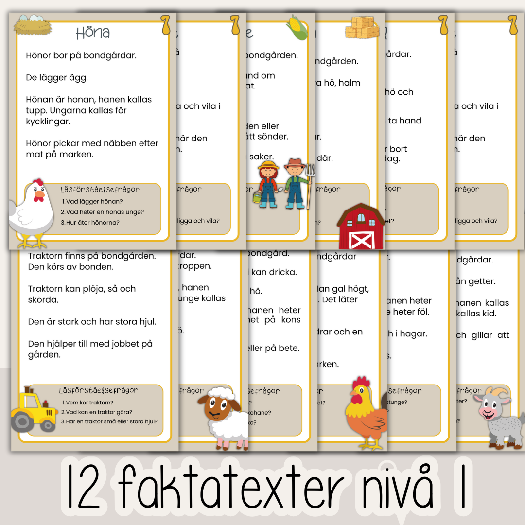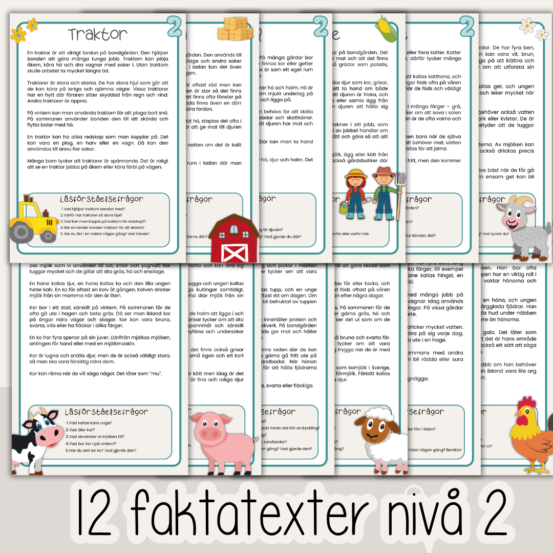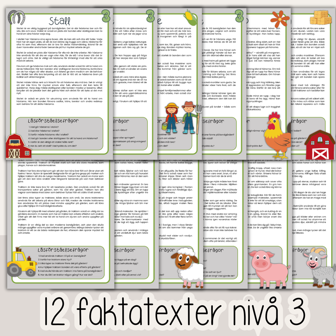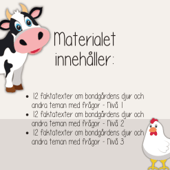Träna på läsförståelse med tema Livet på bondgården. Materialet innehåller tolv faktatexter om olika djur och teman på bondgården. Varje ämne har en lästext med tillhörande frågor. Materialet finns i tre olika nivåer – Nivå 1: Mycket lättläst, Nivå 2: För elever som kommit igång med läsningen, Nivå 3: För elever som läser bra.