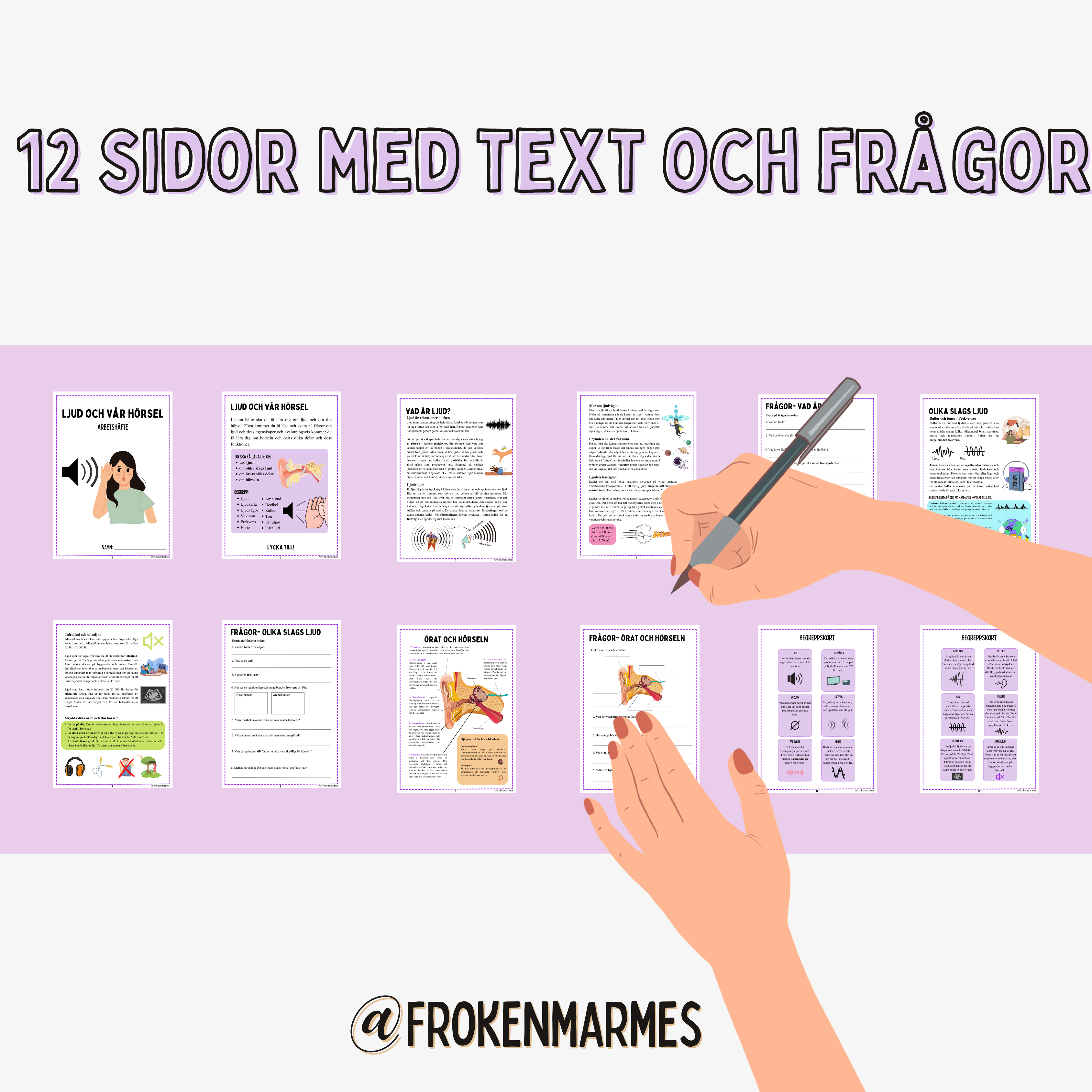 Här kommer ett arbetshäfte på 12 sidor som handlar om hela arbetsområdet ”Ljud och hörseln”. Varje faktasida följs av en sida med frågor kopplat till texten. I häftet ingår det även begreppskort som går att klippa ut och öva på. I detta häfte lär man sig om vad ljud är, hur ljud sprider sig samt örats delar och hörseln. Häftet är anpassat för elever i åk 4-6 men funkar utmärkt till både yngre och äldre årskurser. Går att använda häftet som ett extramaterial eller att basera sin undervisning på.