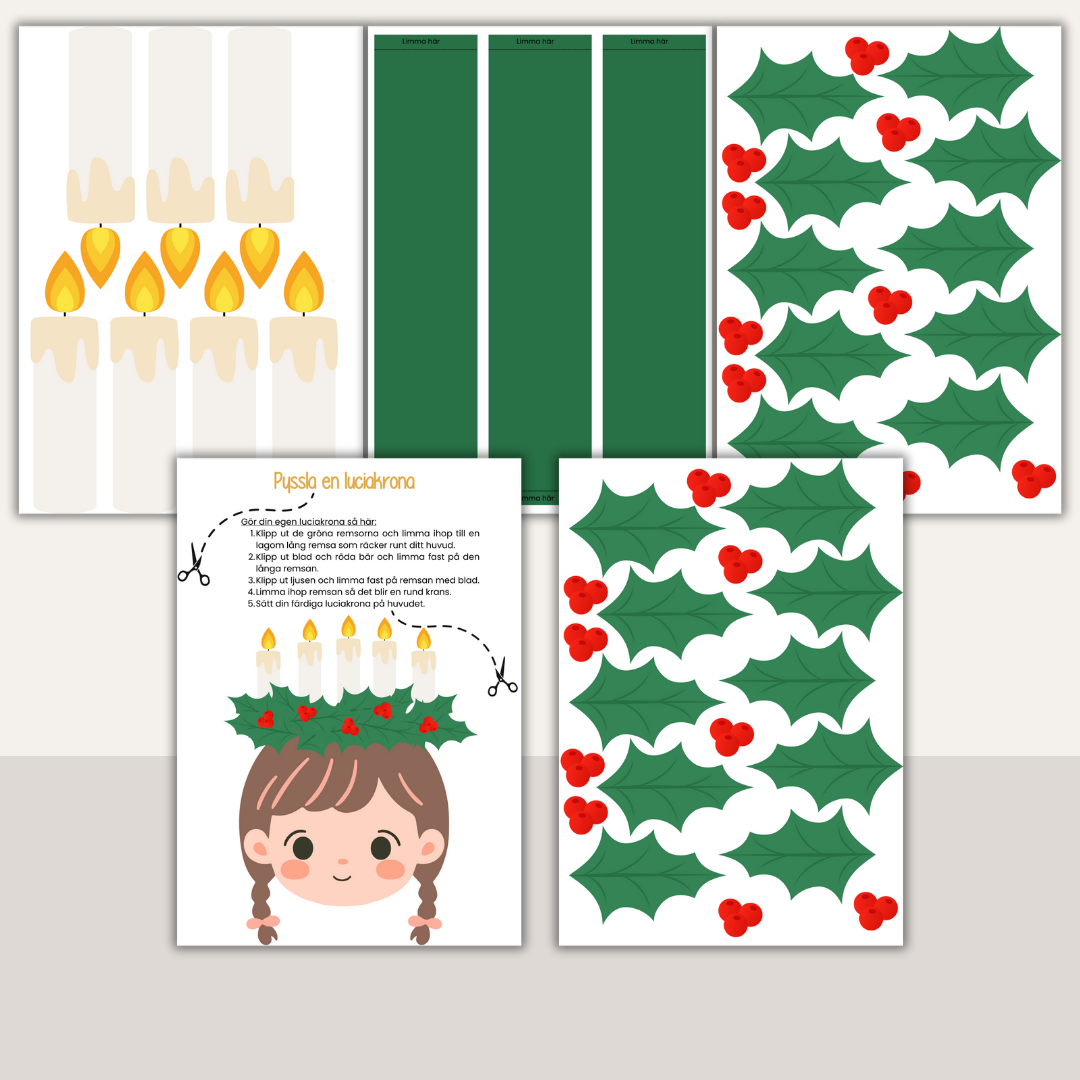 Klipp och klistra en fin Luciakrona! Skriv ut mallarna på ett kraftigt papper och följ instruktionerna.