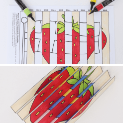 Färglägg, klipp ut, vik och det magiska dragspelet är klart. Om det är svårt att se hur fälten ska färgläggas går det att titta på de medföljande hela bilderna på motiven.