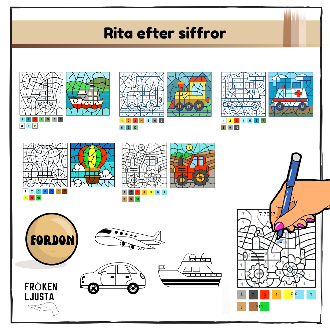 Här finns 10 målarbilder att måla efter siffror med temat fordon.