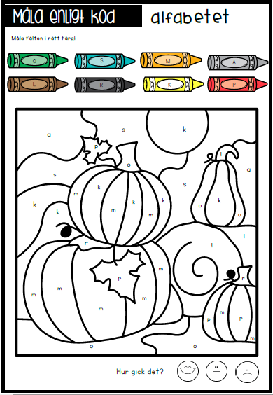 Måla enligt kod stora till små bokstäver! Materialet innehåller 3 arbetsblad.