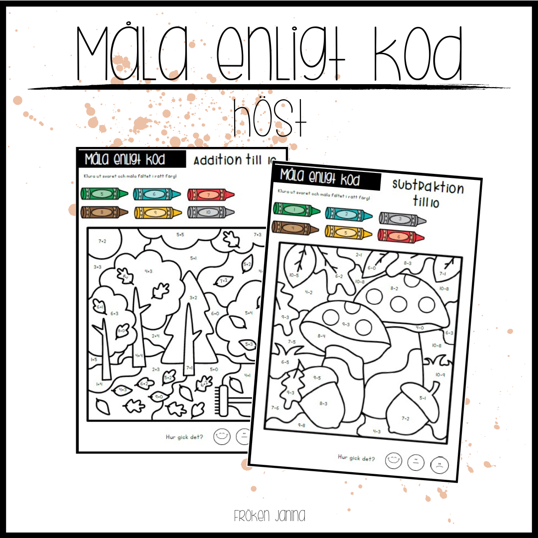 Fyra sidor måla enligt kod: addition 0-10, subtraktion 0-10, addition 0-20 och subtraktion 0-20.