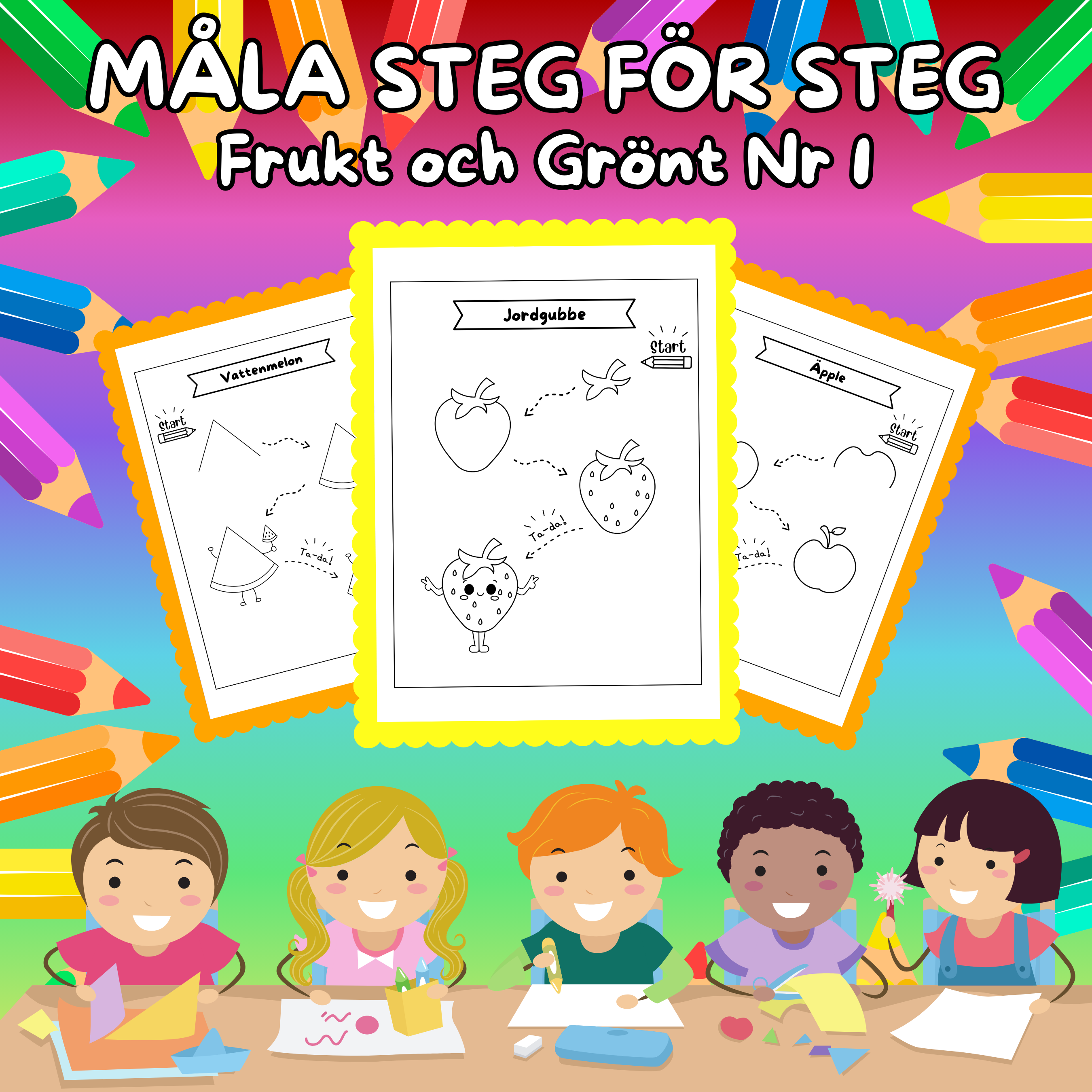 Här får man lära sig rita 10 olika frukter och grönsaker uppställt på 20 sidor där man först får se hur man bygger ihop hela bilden, sen får man prova själv att rita av bilden. Ett roligt och pedagogiskt sätt att lära sig rita.