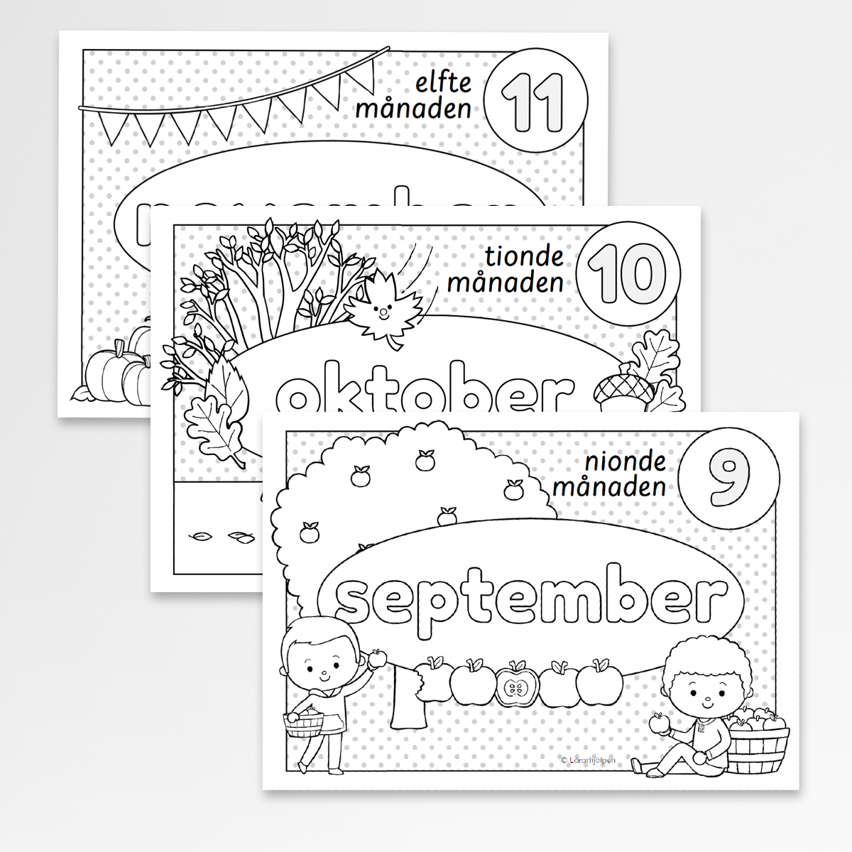 En färgläggningsbild till varje höstmånad: september, oktober och november. Färgläggningsbilderna består av månadens namn, ordning och innehåller bilder som passar till månaden.