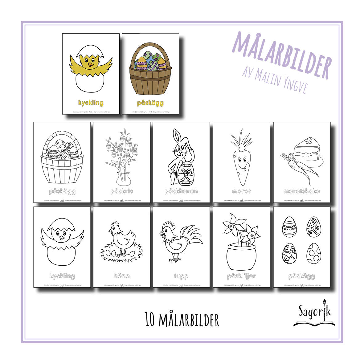 Målarbilder påsk – 10 målarbilder med påskmotiv. Till varje målarbild finns ett ord att färglägga som beskriver vad bilden föreställer. På så sätt tränas barnets läsförståelse på ett enkelt och lustfyllt sätt.