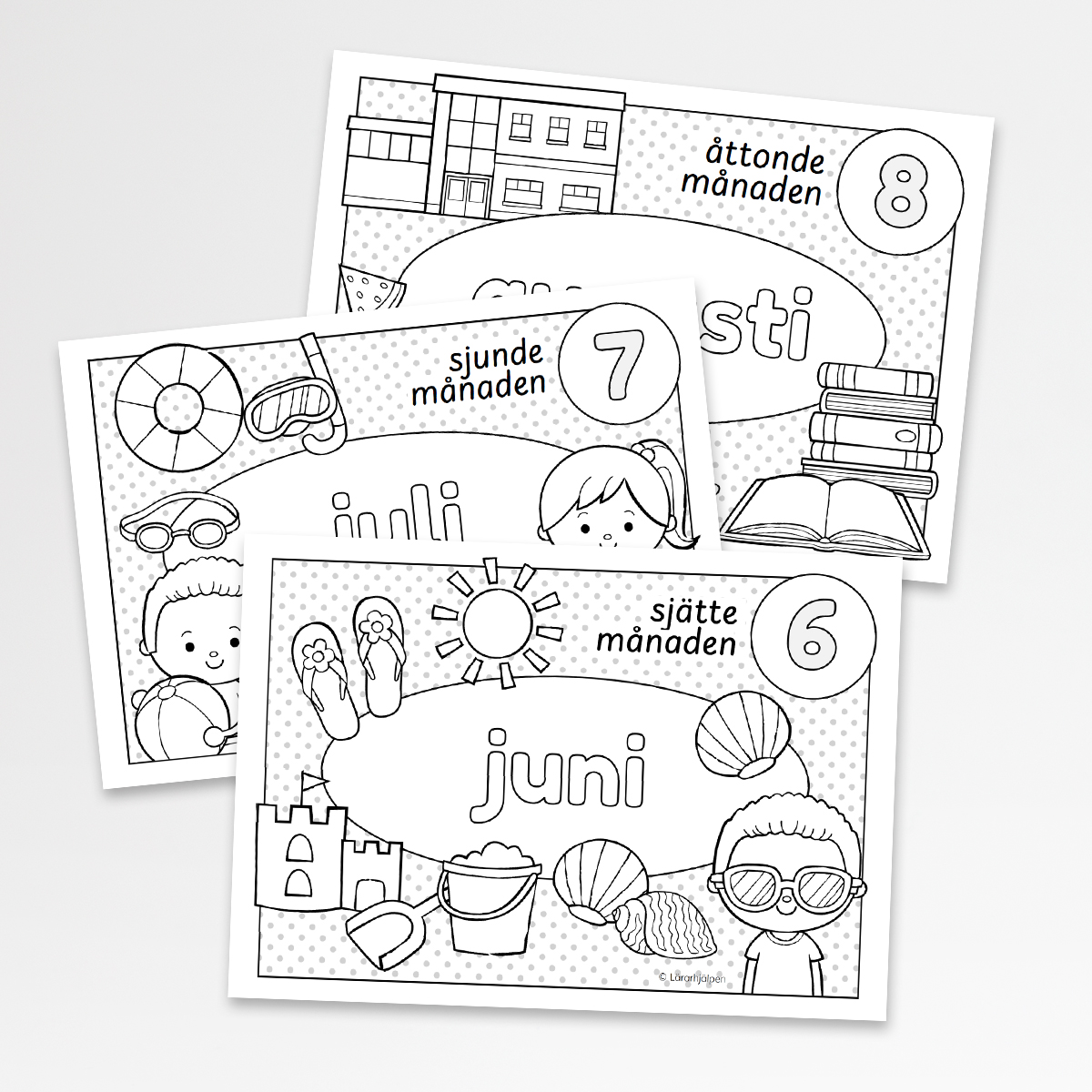 En färgläggningsbild till varje sommarmånad: juni, juli och augusti. Färgläggningsbilderna består av månadens namn, ordning och innehåller bilder som passar till månaden.