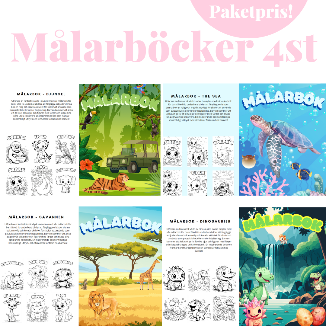 Detta packet innehåller fyra st PDF-filer med målarböcker att färglägga: