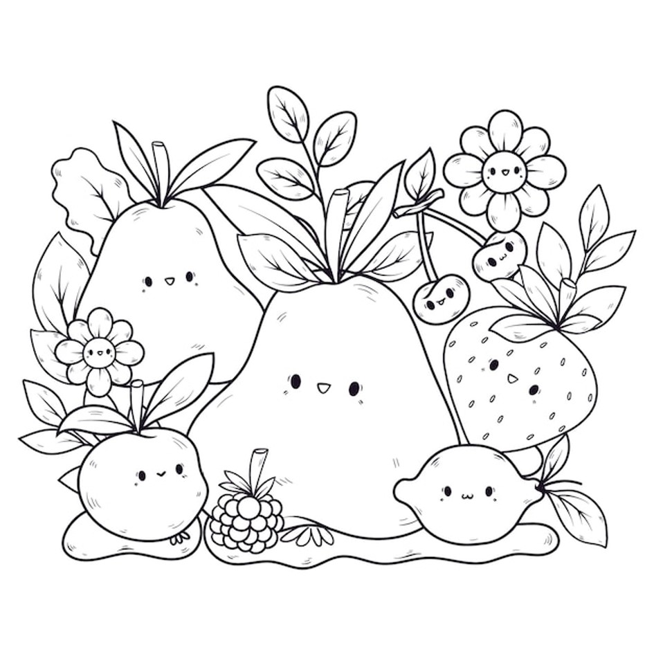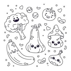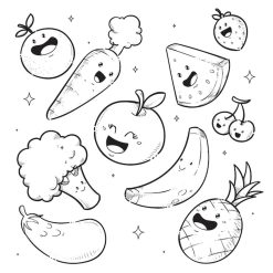 Materialet är ett målarbok med temat frukter och grönsaker.