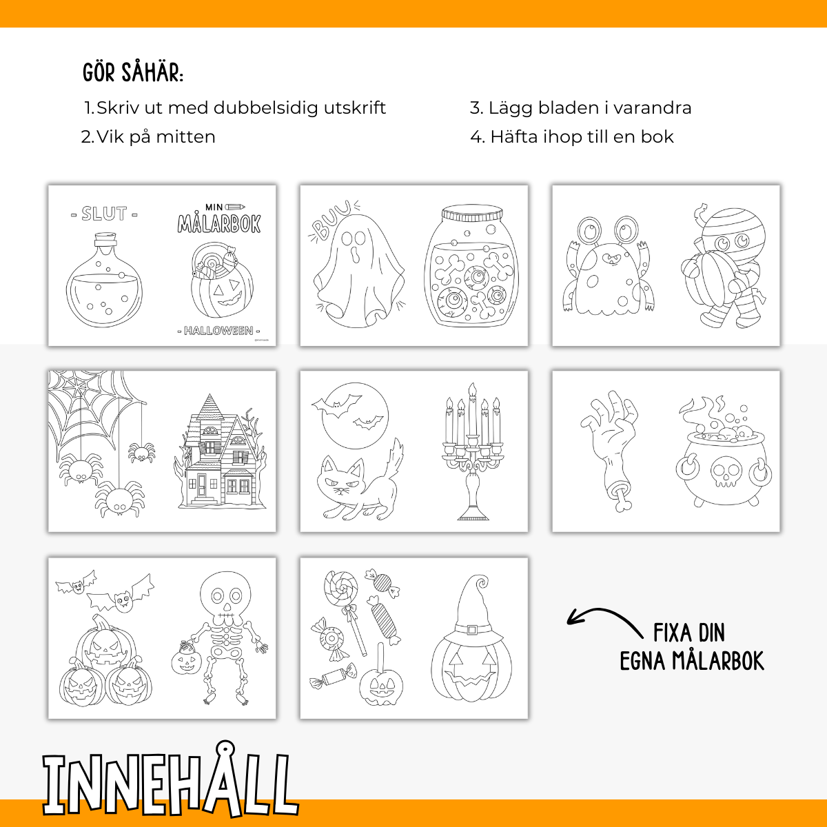 Målarbok med målarbilder till halloween. Skrivs ut med dubbelsidig utskrift, vik alla papper på mitten och häfta ihop till ett häfte. Innehåller 16 målarbilder (inklusive bilderna på fram- och baksidan av häftet).